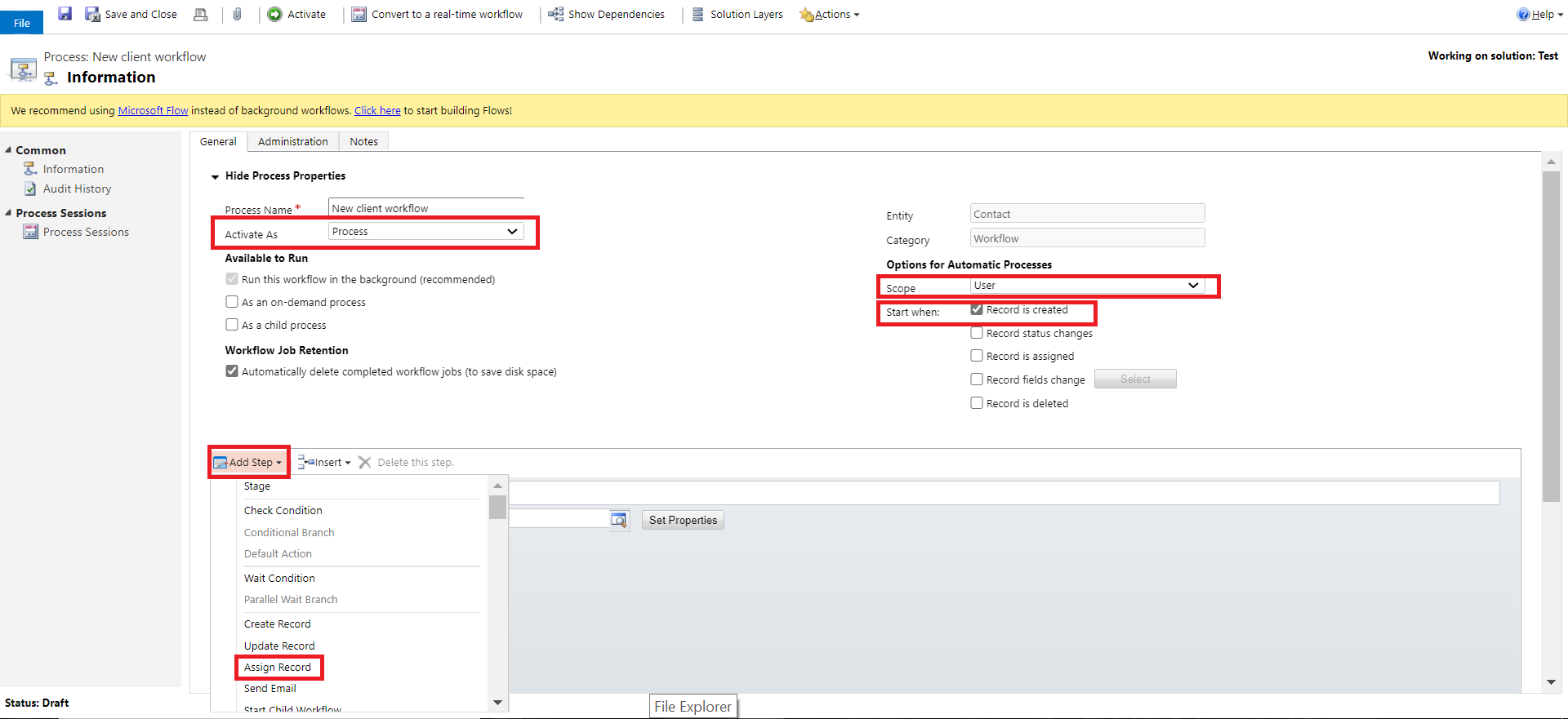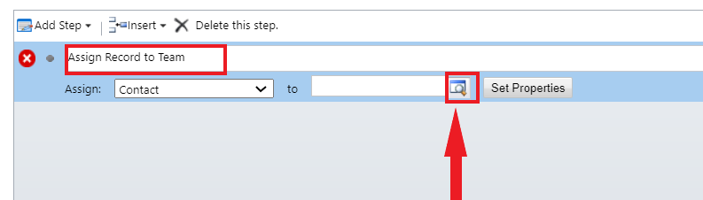 Step 5 - You'll see a brand new step other to the workflow. During this step, we'll specify the user to whom all the created contacts ought to be appointed. Enter the name under of step as Assign Record to Team. The Assign possibility are going to be defaulted because the entity on Which we are Creating the workflow (Contact in our case). Click the search icon.
