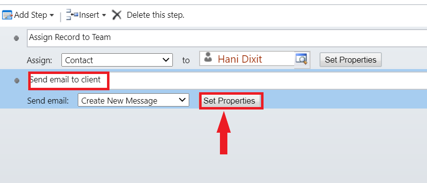 Step 8 − A new step are added. Enter its name as Send email to the client. Click Set Properties.