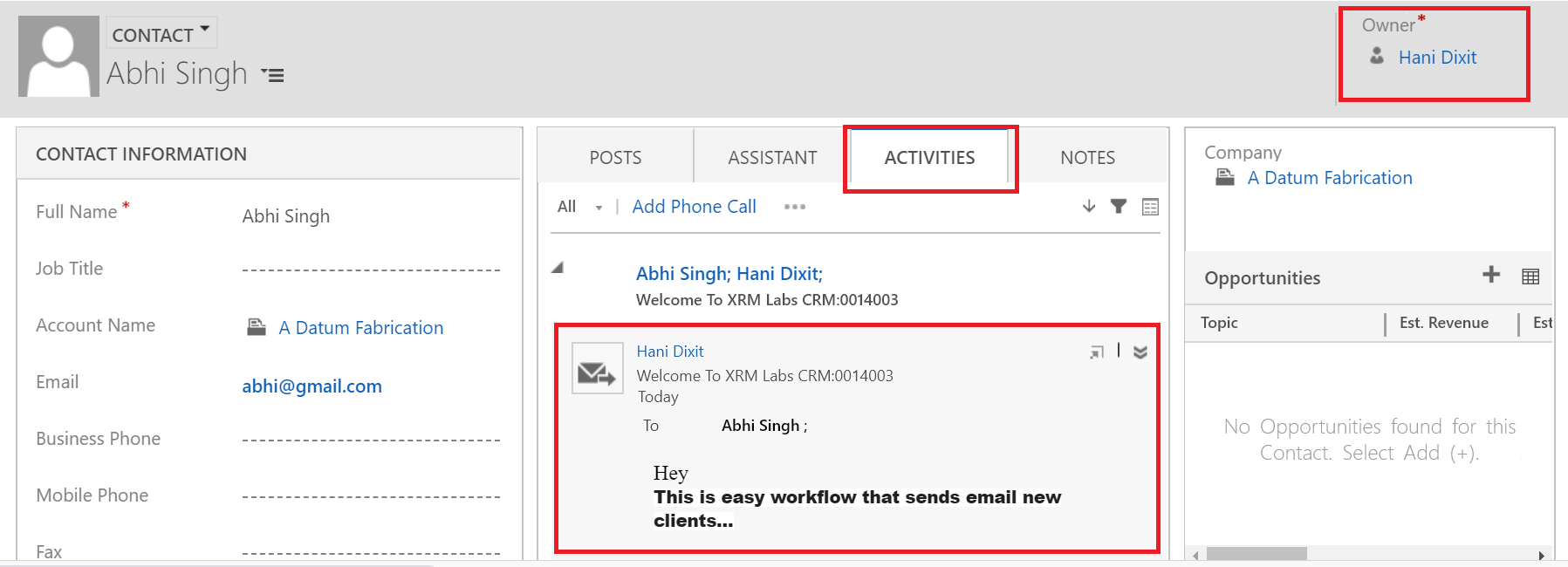 Step 12 − Go to the Contacts tab and make a replacement contact. As presently as you produce a replacement contact by saving the record, you will see the Owner field set to the user, that you simply had designed within the advancement. Also, if you click the Activities tab, you will see associate email activity being created for this contact. This confirms that the advancement ran successfully.